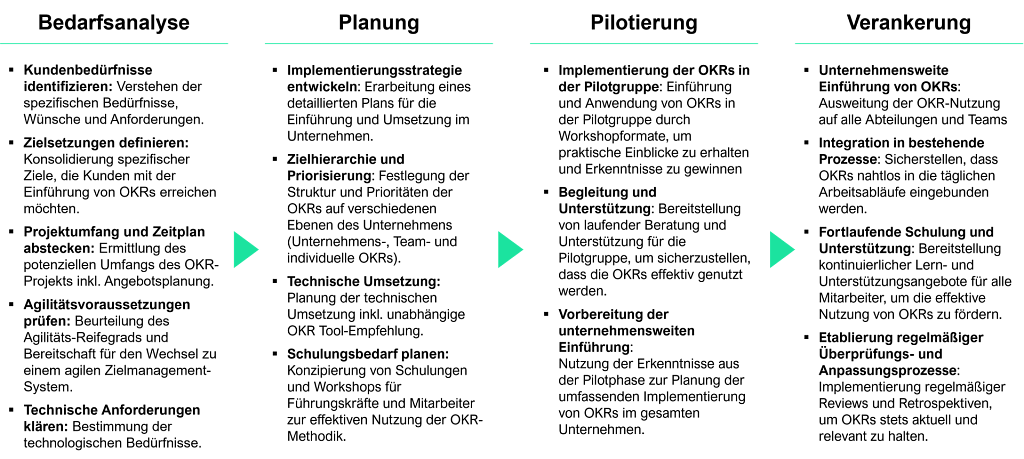 Die Implementierung von OKR (Objectives and Key Results) kann der entscheidende Schritt sein, um Ihr Unternehmen auf die nächste Stufe zu heben. Bei uns erhalten Sie nicht nur eine Methode, sondern einen maßgeschneiderten Prozess, der genau auf die Bedürfnisse Ihres Unternehmens abgestimmt ist. Wir haben einen erprobten und bewährten Ansatz entwickelt, der sicherstellt, dass die Einführung von OKR reibungslos und nachhaltig erfolgt. Dabei arbeiten wir eng mit Ihnen zusammen, um die OKR-Strategie perfekt auf Ihre Geschäftsziele auszurichten und eine hohe Akzeptanz im gesamten Team zu erreichen.